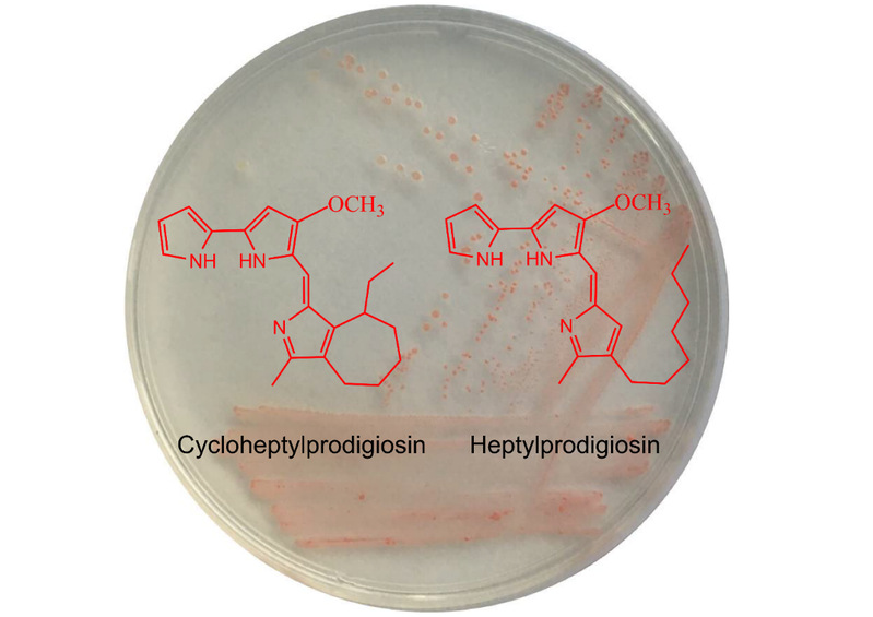 灵菌红素(prodigiosin)是微生物产生的一类红色素,其结构中具有三个吡咯环。灵菌红素在抗菌、抗肿瘤、免疫抑制、抗病毒、纺织染料等方面都具有重要生物活性及应用前景。