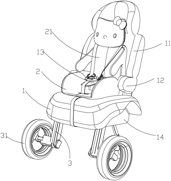 本实用新型公开了一种两用儿童安全座椅,包括底座,底座上设有靠背,靠背设有向前延伸的扶手,底座上设有婴儿软坐垫,靠背上设有与软坐垫连接的软靠背,底座和靠背连接设有安全带,底座的两侧均设有前支架槽,前支架槽上铰接设有前支架,前支架槽设有弹簧扣,底座的底部中间设有后支架槽,后支架槽过盈配合铰接设有后支架,前支架设有大前轮,后支架设有小后轮,本实用新型在乘车时可以做为普通安全座椅使用,在下车时可以做为儿童手推车使用。产品外观结构设计完整,可进行手板制作和小批量试产。(专利号:ZL 2017 2 0596012.4)