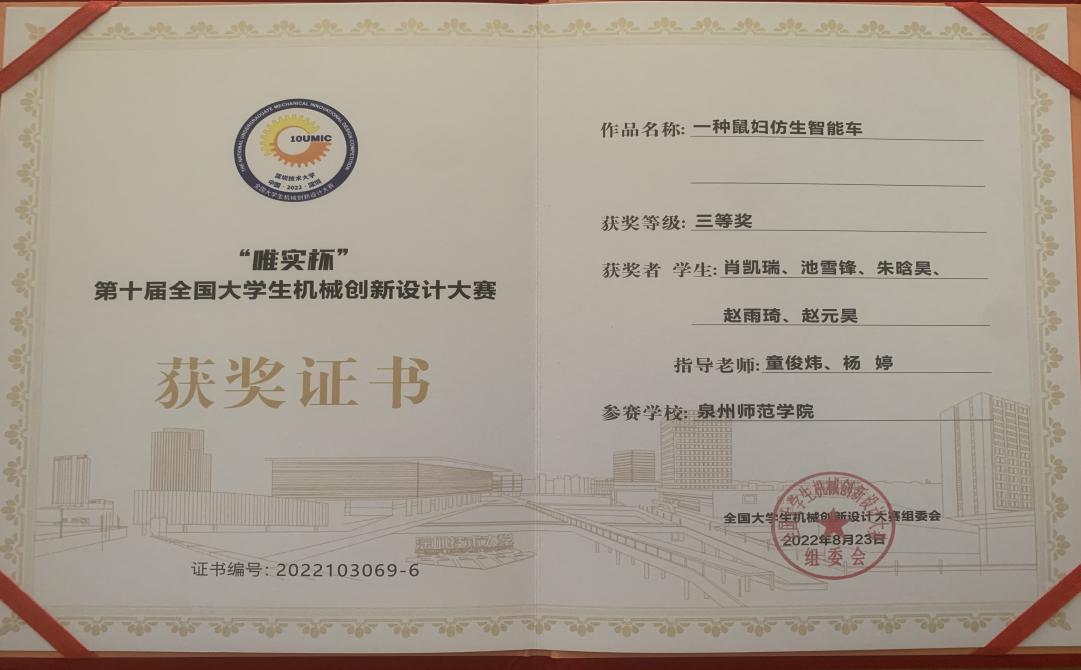 在此前7月份举行的省赛全国预选角逐中,交航学院汽服专业派出两支代表队参赛。其中,作品《一种鼠妇仿生智能车》荣获福建省一等奖,作品《六足搜救仿生机器人》(成员:池雪锋、任豪杰、于程丽、李世荣、赵嘉奕 指导老师:童俊炜、施生明)荣获福建省二等奖。