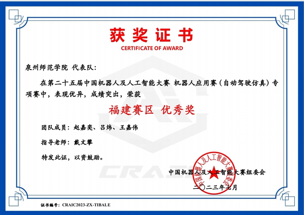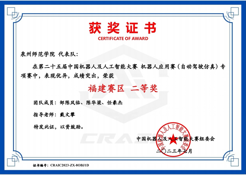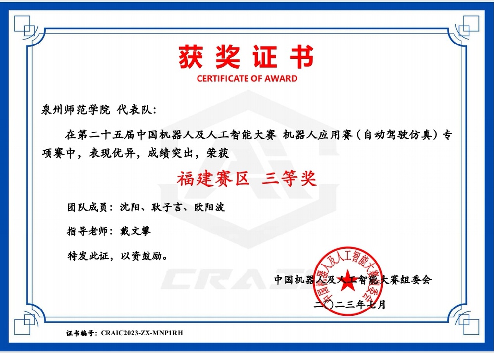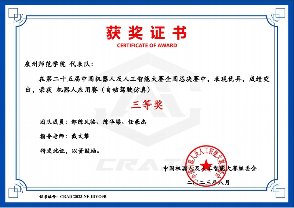 我院汽车服务工程专业学子首次组队参赛,经过省赛、国赛层层选拔,荣获第二十五届中国机器人及人工智能大赛全国总决赛-机器人应用赛(自动驾驶仿真)三等奖(团队成员:邹陈风临、陈华梁、任豪杰,指导老师:戴文攀),填补了学校在此项赛事的空白。