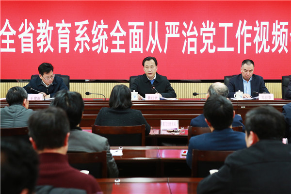 他强调,要把党的政治建设摆在首位。牢固树立“四个意识”,深入学习贯彻习近平新时代中国特色社会主义思想,时时处处事事维护习近平总书记党中央的核心、全党的核心地位,始终在政治立场、政治方向、政治原则、政治道路上同以习近平同志为核心的党中央保持高度一致。严明政治纪律和政治规矩,尊崇党章,严格执行民主集中制,坚决防止“七个有之”,做到“五个必须”。贯彻党的教育方针,落实立德树人根本任务,严格落实意识形态工作责任制。严肃教育系统党内政治生活,严格执行《关于新形势下党内政治生活的若干准则》等制度。树立正确用人导向,认真把好政治关、廉洁关、形象关。全面深化新时代教师队伍建设,最大限度防止出问题,最大限度激发积极性。要以改进作风增强教育获得感。坚持以师生为中心,把师生利益放在心中最高位置。加强纪律建设,重点强化政治纪律和组织纪律,带动廉洁纪律、群众纪律、工作纪律、生活纪律严起来。密切关注隐形变异、潜入地下的享乐主义、奢靡之风,以更大力度整治改头换面的形式主义和官僚主义。狠抓义务教育择校热、校外培训机构乱象,农村义务教育公办寄宿制学校学生营养改善计划,民办高校、中外合作办学全面从严治党等突出问题的治理。要压紧压实管党治党政治责任。党委(党组)主体责任要“抓实”,纪委监督责任要“从严”,守土有责,守土尽责。领导干部必须以上率下,当好“头雁”,带头讲政治、守规矩、主动接受监督、真抓实干。各级党组织要健全激励机制和容错纠错机制,让广大干部愿干事、敢干事、干成事。