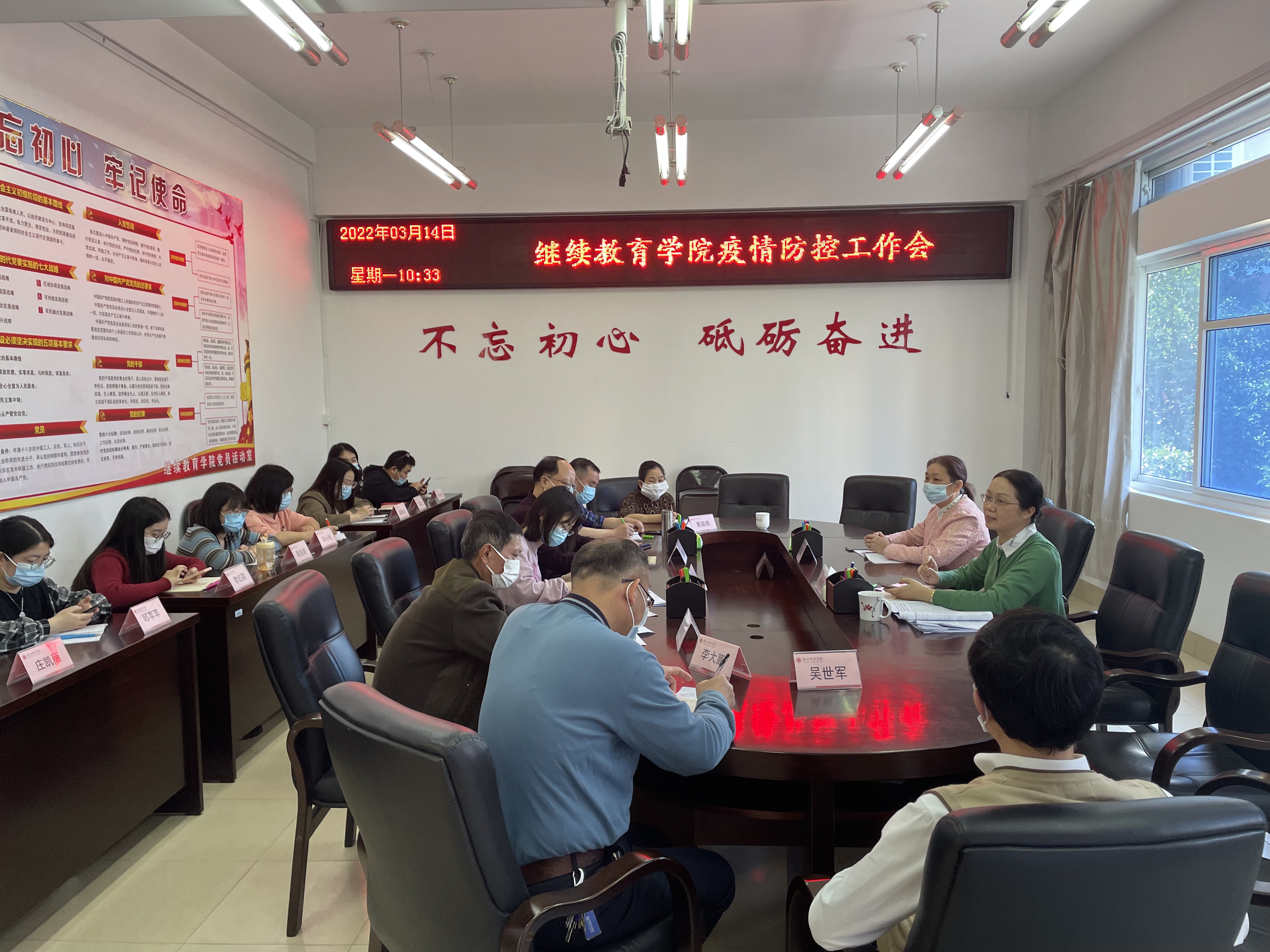 陈秋燕指出,近期国内疫情多点散发、局部暴发,多个省份出现师生感染,有的地区发生校园聚集性疫情。全校上下要把思想和行动迅速统一到中央和省委、市委决策部署上来,深刻认识做好校园疫情防控工作的特殊重要性,不折不扣落实全省学校疫情防控工作视频会议精神,坚持“外防输入、内防反弹”总策略、“动态清零”总方针,落实“四早”要求,压实四方责任,维护师生员工生命安全和身体健康,维护校园安全稳定。会上就学院下一阶段的疫情防控工作做了进一步部署,一是培训工作方面,学院的培训工作也要随之调整,原定3月14日校内开班的泉运财务培训班推迟举行;下一周计划开班的培训班改为线上开班,停课不停训;在滨海酒店举行的校长班暂时停课。二是学院疫情防控措施要落细,防疫物品要配齐,全院教职工非必要不出省、不出市,近期学院原则上不承担校外各类线下会议与培训。三是军转班的学员管理参照本科生教学管理,督促学员做好疫情防控工作。(办公室吴纾恬)