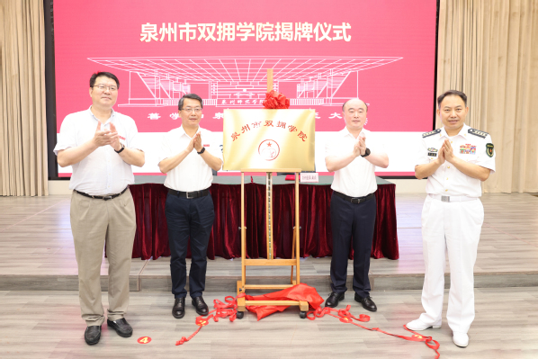 黄景春、李宣良、柯瑞清和夏侯建兵共同为泉州市双拥学院揭牌。