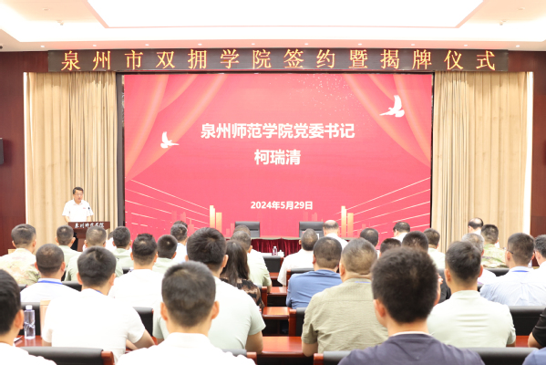 5月29日上午,泉州市退役军人事务局与开云kaiyun官网共建“泉州市双拥学院”签约暨揭牌仪式在开云举行。泉州市委常委、市政府常务副市长黄景春,泉州市委常委、泉州军分区大校政治委员李宣良,校党委书记柯瑞清、副校长夏侯建兵出席活动。泉州市人民政府副秘书长曾国志,泉州市退役军人事务局局长唐良元等相关负责人,学校相关职能部门负责人、继续教育学院党政负责人,2023年军转干部培训班学员参加。
