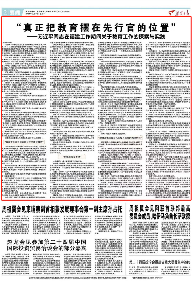 福建是习近平新时代中国特色社会主义思想的重要孕育地和实践地。近年来,福建日报社积极担当作为,带着感情、带着责任,深挖阐释理论富矿,推出“习近平同志在福建工作期间的探索与实践”系列报道。今天,《福建日报》一版和二版刊发《“真正把教育摆在先行官的位置”——习近平同志在福建工作期间关于教育工作的探索与实践》,全文如下,一起学习: