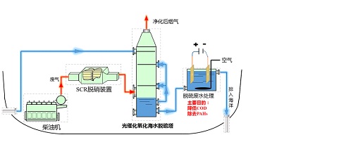 采用轻质规整光催化陶瓷填料烟气脱硫催化剂,在相同温度和光催化剂活性组分与陶瓷载体上,一个吸收塔内仅利用海水、光催化剂和等离子UV辐射灯就可脱除烟气中的SO2。摒弃目前国内外舰船柴油机烟气脱硫的MgO和CaO药剂法,避免舰船携带危险的化学脱硫剂以及脱硫副产物的产生,提高了舰船运输和航行中的安全性。将电催化氧化曝气与光催化多环芳烃降解相结合,使脱硫脱硝后的废海水达标排放,同时极大减小占地面积。采用射流反应器既降低了烟气温度,对烟气中夹带的固体颗粒、未燃烧完全的有机杂质和部分SO2进行脱除;喷射器还可对冷却后的烟气增压,省去体积庞大、费用昂贵的增压风机。实现各工序设备单元的撬装、模块化和标准化设计与加工制造,最大限度地降低制造成本,加快制造速度和安装进度,运输方便。