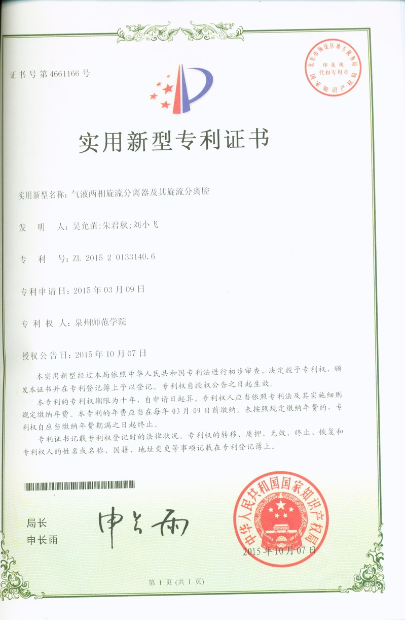 成果名称:气液两相旋流分离器及其旋流分离腔