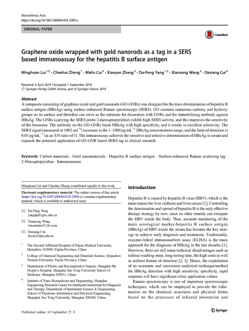 国家自然科学基金面上基金“多功能Au@Ag 异质纳米棒探针的制备及在病原细菌诊疗中的应用研究”(项目负责人:杨大鹏;项目编号:81472001;2015年1月~2018年12月)。中试,拓展微纳米材料的生物模板法合成方法和产业化技术。