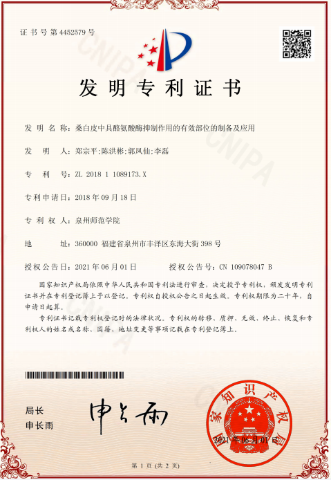 成果名称:桑白皮中具酪氨酸酶抑制作用的有效部位的制备及应用