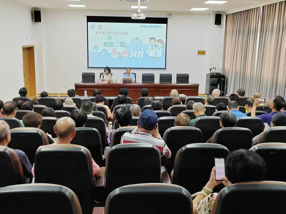 讲座分为两场。第一场由福建医科大学附属第二医院内分泌科主任黄惠斌教授作《如何防治糖尿病》主题讲座。第二场由心血管内科副主任医师李维维作《高血压的危害与防控》主题讲座。