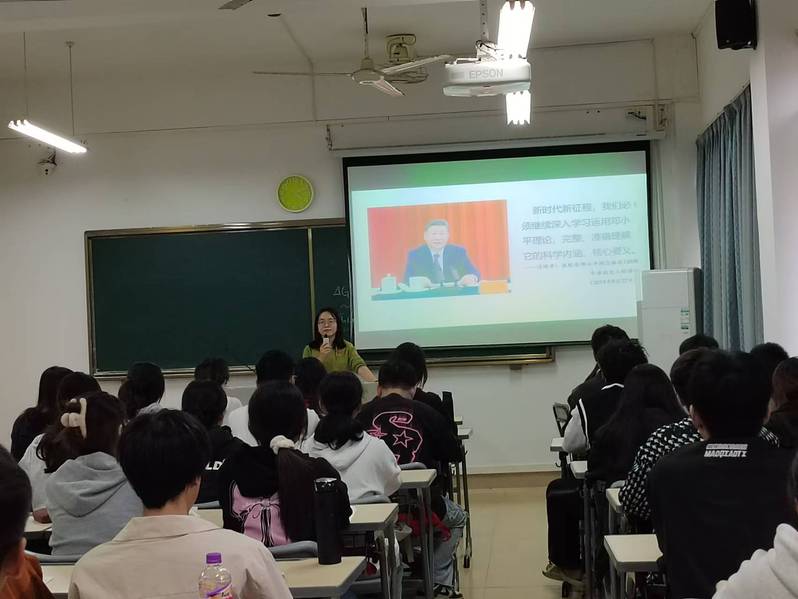 饶佳妹老师围绕专题七“邓小平理论”这一主题,以案例为导入,首先向学生介绍了2024年8月22日习近平总书记在纪念邓小平同志诞辰120周年座谈会上讲话的主要内容,以习近平总书记指出的“我们必须继续深入学习运用邓小平理论,完整、准确理解它的科学内涵、核心要义”为依循,全面精讲了邓小平理论的科学内涵和核心要义。饶老师还专门讲解了“邓小平与中国式现代化的开启”这一内容,阐述1979年3月23日邓小平正式提出“中国式的现代化”及其内涵,使学生对“邓小平理论是社会主义建设的科学指南”这一教学要点有了更深的理解。