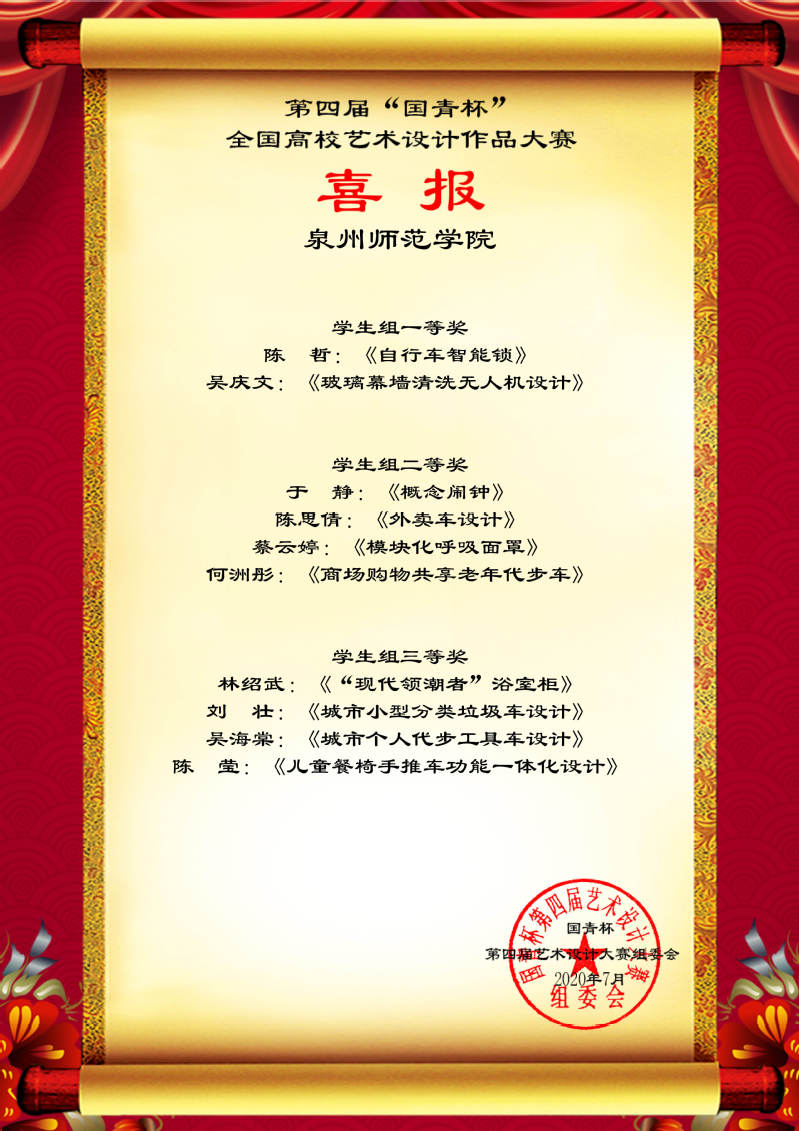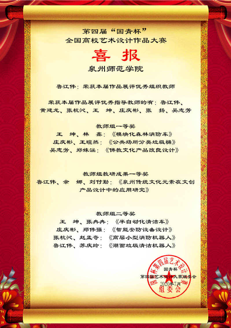 美院为推动设计内涵式发展,加大艺术设计作品的交流合作,发挥“以赛代练、以賽促教、以赛促学”的主旨。积极参加第三届“国青杯”艺术设计大赛。赛前积极准备,老师们认真指导,经过筛选将优秀作品推送大赛评审,美院本次共获得如下奖项: