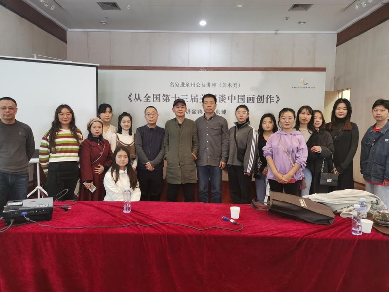 2020年11月28日上午,我院20级国画研究生在泉州画院二楼展厅参加“名家进泉州”公益讲座(美术类)活动。讲座由民盟中央美术院副院长、中国画学会理事郭东健老师作《从全国第十三届美展谈中国画创作》精彩讲谈。