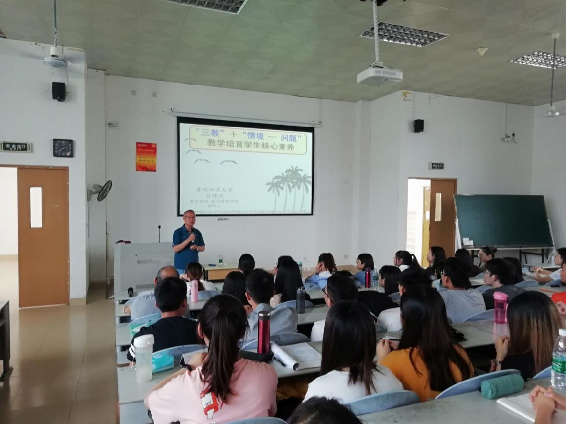 2019年5月15日下午,著名数学教育家、贵州师范大学原副校长吕传汉教授应邀到数学与计算机科学学院理工楼419作“‘三教’+‘情境-问题’教学培育学生核心素养”的专题讲座。数学专业全体学生和部分教师聆听了本次讲座。本次讲座由数学与计算机科学学院陈明玉院长主持。