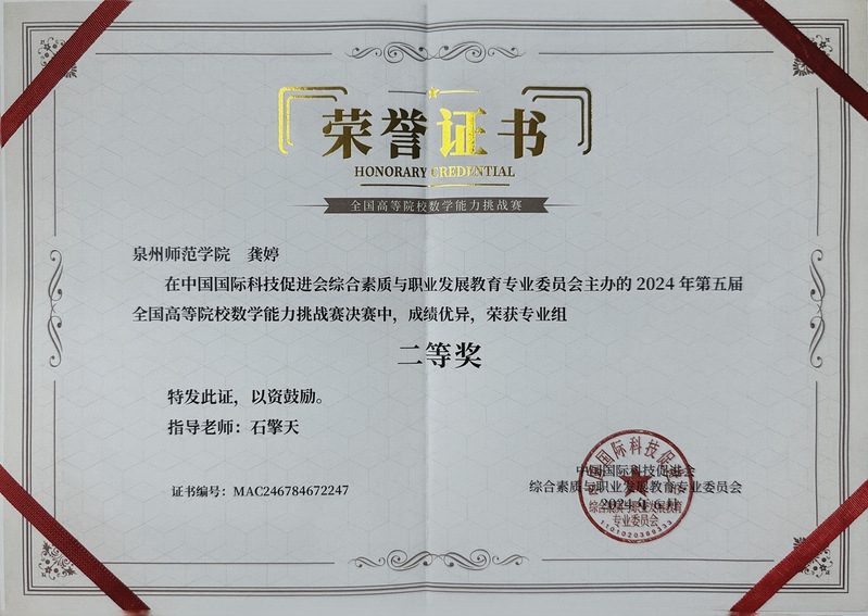 2024年第五届全国高等院校数学能力挑战赛决赛已于6月23日顺利结束,我院共有10名同学入围决赛,最终来自20数学2班的龚婷同学斩获二等奖,同时杨昔阳,郑雪静,赖宝锋,石擎天,吴向群五位老师获得优秀指导老师称号,数学与计算机科学学院被评为优秀协办单位。