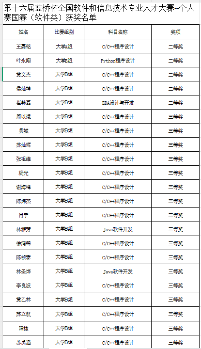 第十六届“蓝桥杯全国软件和信息技术专业人才大赛”全国总决赛传来喜报,数学与计算机学院学子在高大利、曾台盛等老师带领下,凭借出色的发挥,再创佳绩、再攀新高,王嘉铭获得软件类大学A组(985、211高校组)全国二等奖(开云学生首次跳级参加),黄文杰、侯灿坤、叶永翔获软件类大学B组全国二等奖,崔韩磊获得电子类大学B组全国二等奖,黄乙林等17位同学获得大学B组全国三等奖。