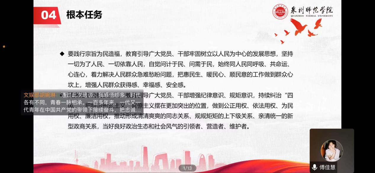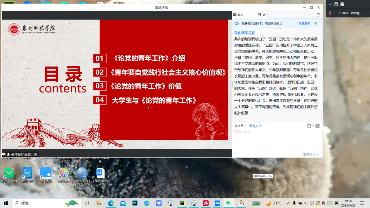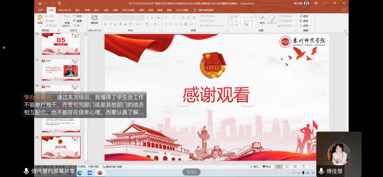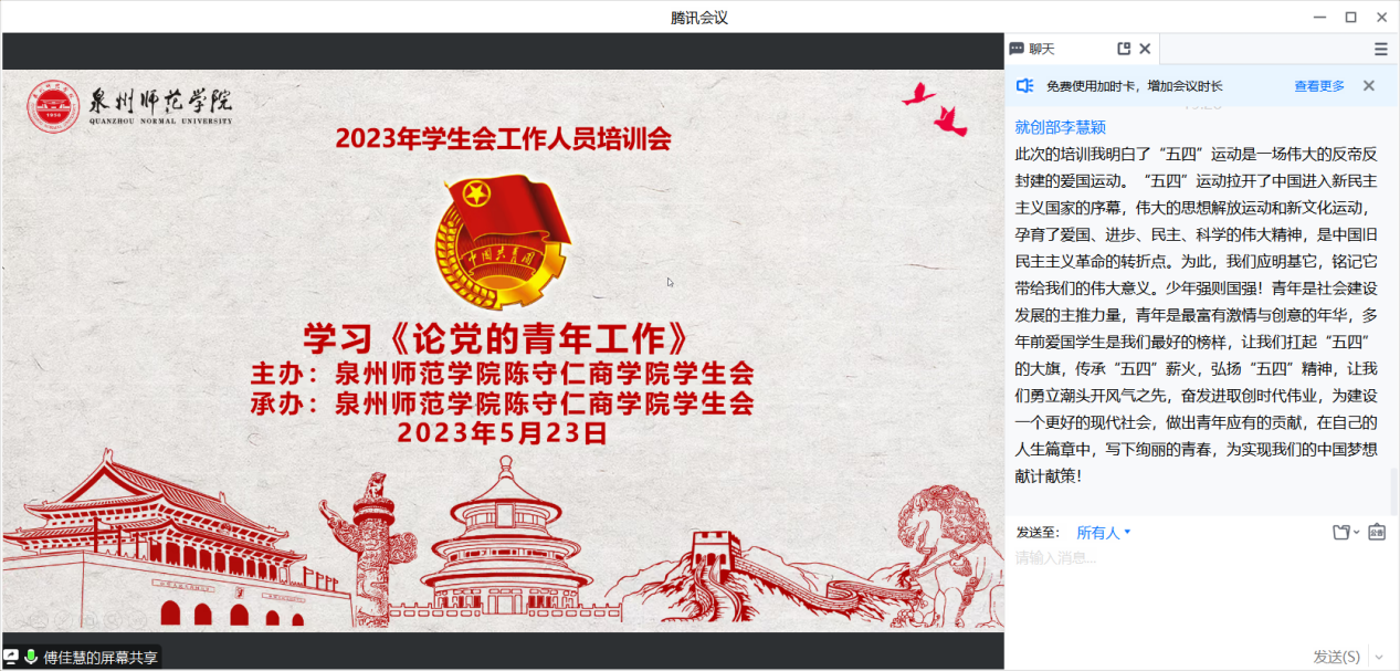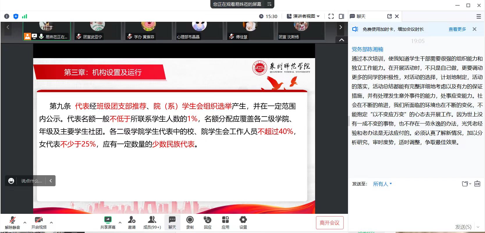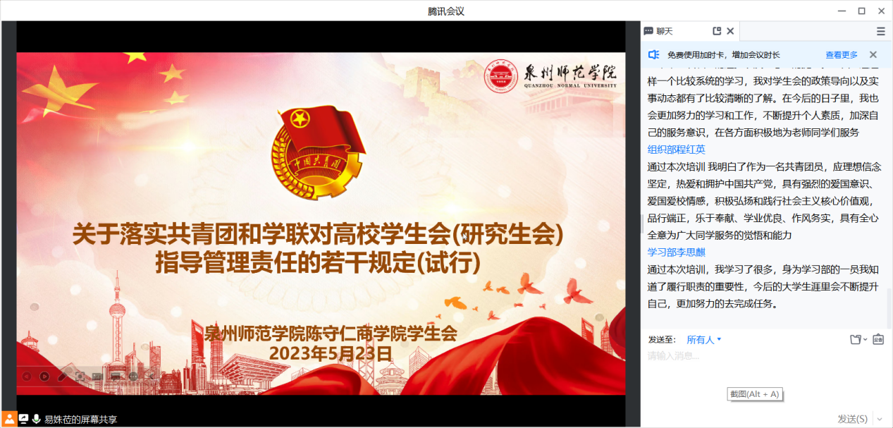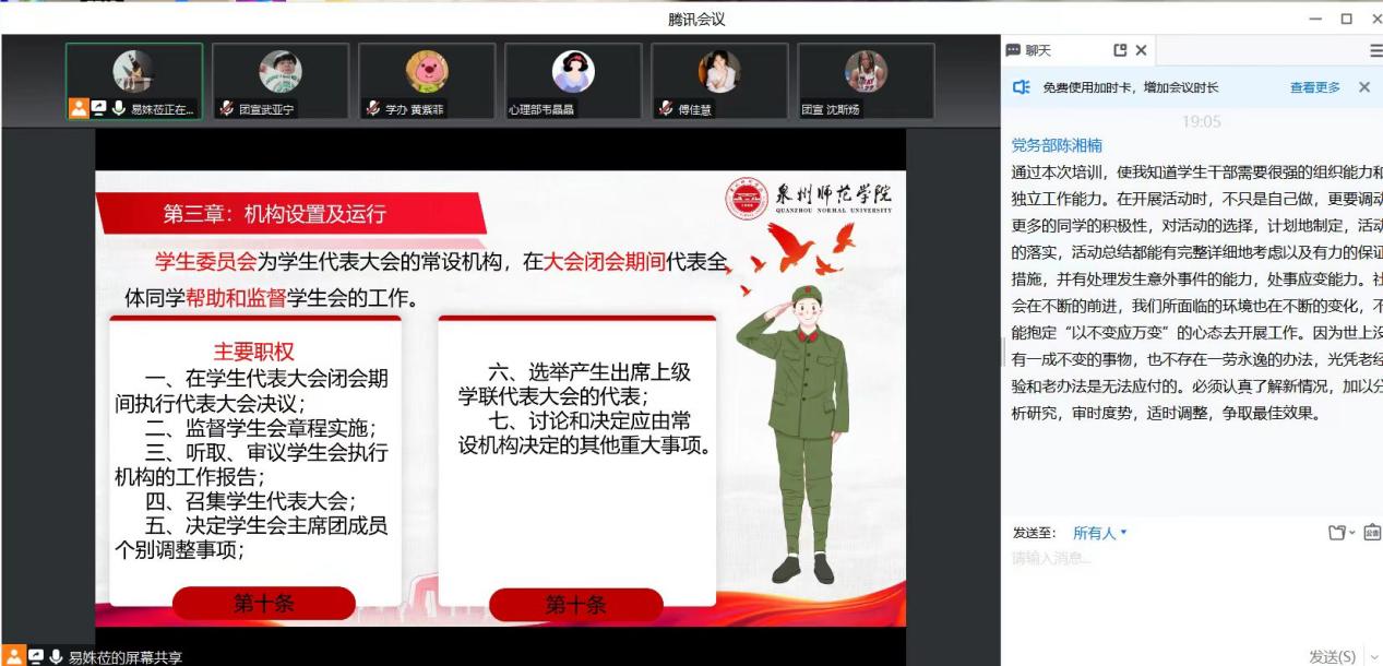 为深入学习贯彻党的二十大精神,坚持用习近平新时代中国特色社会主义思想引领青年思想、凝聚青年力量,推进学生会组织深化改革成果落地见效,健全和完善学生会管理工作制度,5月23日陈守仁商学院通过腾讯会议举办学生会工作人员培训班,由学生会主席团成员易姝莅、张宏斌、傅佳慧分别进行讲解。