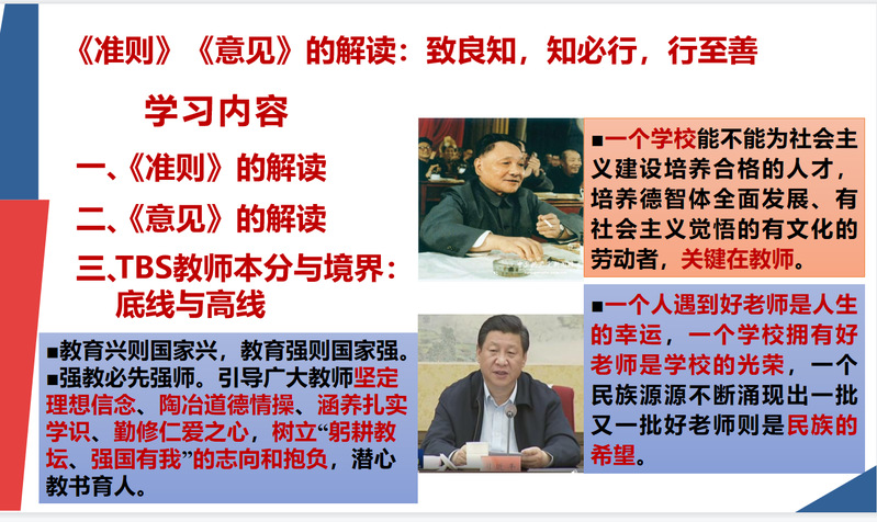 6月15日下午,我院召开师德师风专题教育第二次大会,全体教职工参加了会议。学院党委副书记、常务副院长组织学习并详细解读《新时代高校教师职业行为十项准则》《教育部关于高校教师师德失范行为处理的指导意见》(以下简称《准则》《意见》)等文件精神,并对师德师风的整治工作作了进一步部署安排。他指出,学院将进一步健全长效机制,将师德师风建设纳入常态化管理。开展违反师德师风行为排查,对照《准则》和《意见》,深入排查师德师风存在的突出问题和薄弱环节,强化工作落实主体责任,深化师德师风综合治理。设立举报电话、意见箱,畅通师德师风监督举报渠道,构建学校、教师、家长、学生、社会“五位一体”的师德监督网络。他要求全体教职员工要开展自查自纠工作,以实际行动切实推动学院师德师风建设,进一步增强为人师表、教书育人的自觉性,合力营造学院充满正能量、积极向上的育人环境。