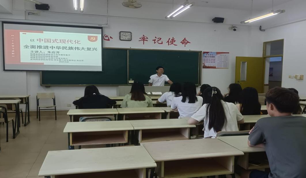 朱应开老师结合党的二十大精神,从什么是“ 现代化”、中国式现代化的五大特征、中国式现代化取得的成就、在高质量发展中不断推进中国式现代化四个方面为同学们展开讲述,指出当代青年是中国式现代化建设的参与者、主力军,勉励同学们要珍惜时间,好好学习,提升本领,为推进中国式现代化,实现中华民族伟大复兴贡献青春力量。