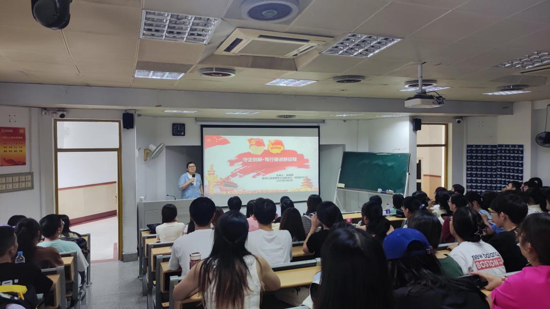 学院团委副书记吕赫阳结合暑期随马院思政教师培训的经历与感悟,以“守正创新·笃行奋进新征程”为题,给学院两委学生主干130人上团课,通过探寻中国“睁眼看世界”的起航之地北外滩的过去、现在与未来,穿越时间、跨越空间,展现了作为“新时代都市发展新标杆”的北外滩践行“人民城市人民建,人民城市为人民”重要理念的宏伟蓝图,阐释了中国式现代化在虹口的生动实践。弘扬以伟大建党精神为源头的中国共产党人精神谱系,教育引导学生知史爱党、知史爱国,不断强化责任意识、奉献意识,勇于担当时代赋予的神圣使命,锤炼过硬本领,使自己的视野、观念、认识跟上越来越快的时代发展步伐。