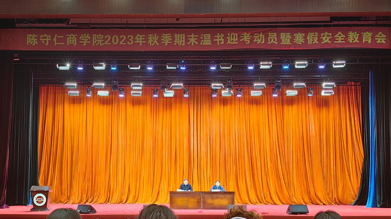 临近期末,为切实加强学院的学风建设,做好学生安全教育管理工作,构建和谐安全的校园环境,2023年12月21日,陈守仁商学院在陈祖昌大礼堂召开期末温书迎考暨寒假安全教育大会。非毕业班全体同学参加此次会议,党委副书记曾文超、副院长余鲲鹏出席会议并布置相关工作。