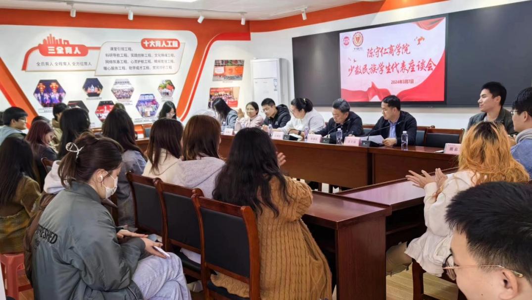 为了进一步加强各民族学生的沟通和交流,铸牢中华民族共同体意识,营造民族团结一家亲的良好育人氛围,日前,陈守仁商学院在学生宿舍C区一站式社区召开学生代表座谈会,学院党委书记胡凌松、全体辅导员、各民族学生代表参加, 座谈会由学院党委副书记曾文超主持。