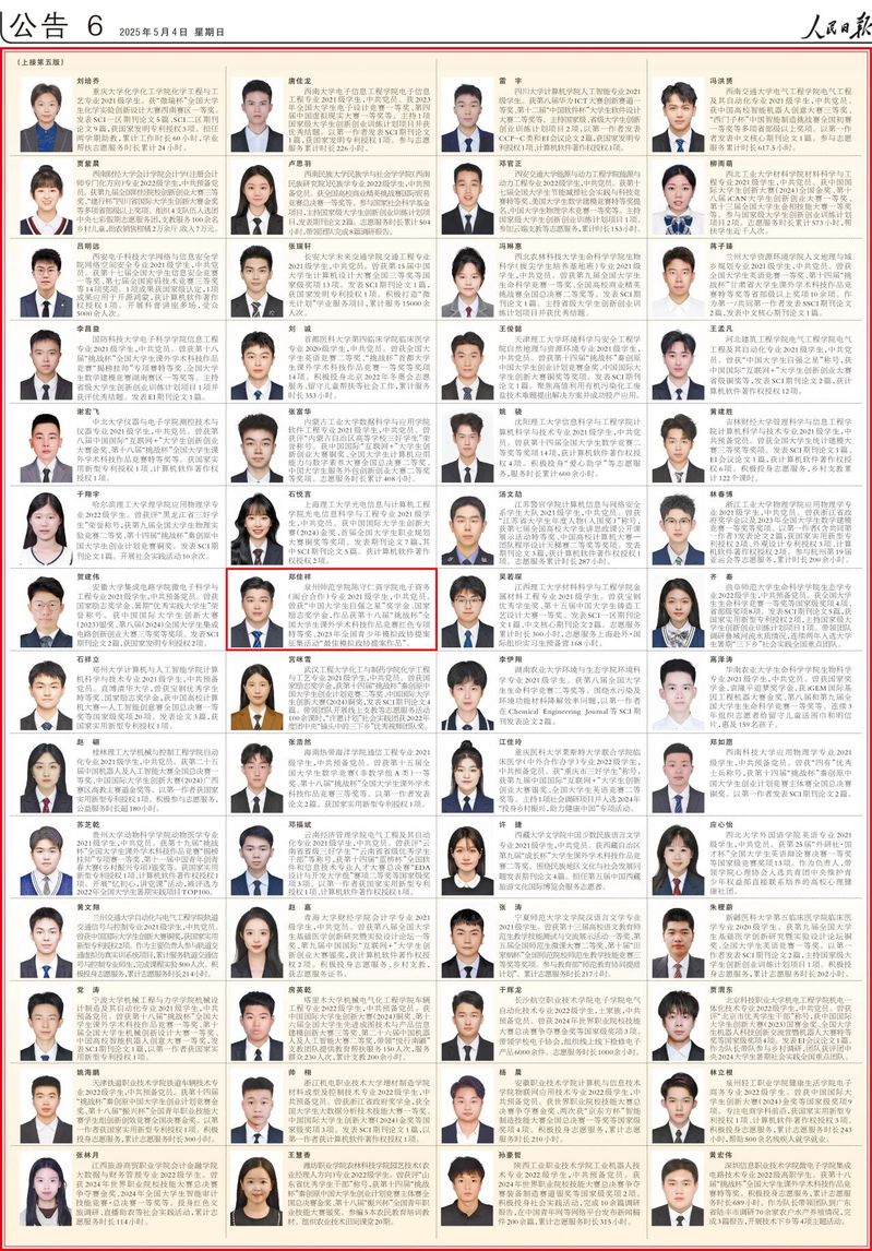 5月4日,《人民日报》刊登了100名2023—2024学年度本专科生国家奖学金获奖学生代表名录,我院学子郑佳祥上榜。