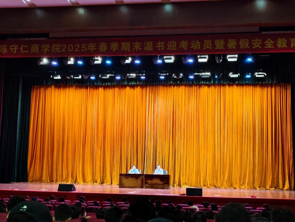 为进一步强化学生考风考纪意识,激发学习热情,营造积极向上的备考氛围,同时扎实做好暑假安全教育管理工作,日前,陈守仁商学院在陈祖昌礼堂召开2025年春季期末温书迎考动员暨暑假安全教育大会。学院党委副书记曾文超、副院长余鲲鹏出席会议,全体非毕业班学生参会。