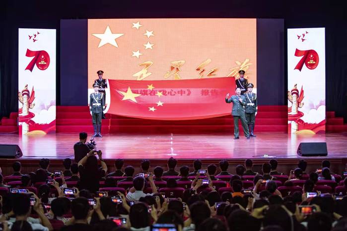 报告会上,四名天安门国旗班护卫队旗手手擎“天安门广场版”特号无缝国旗正步入场,现场师生们依次抚摸着国旗、瞻仰着国旗,并纷纷和国旗合影,感受国旗带来的力量,将报告会推向高潮。