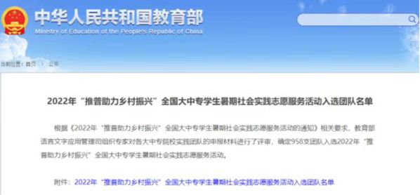 7月6日,教育部发布《2022年“推普助力乡村振兴”全国大中专学生暑期社会实践志愿服务活动入选团队名单》,由开云国家语言文字推广基地、校团委、文学与传播学院团委组织选送的开云kaiyun官网“赴新疆推普 助乡村振兴”实践队成功入选。