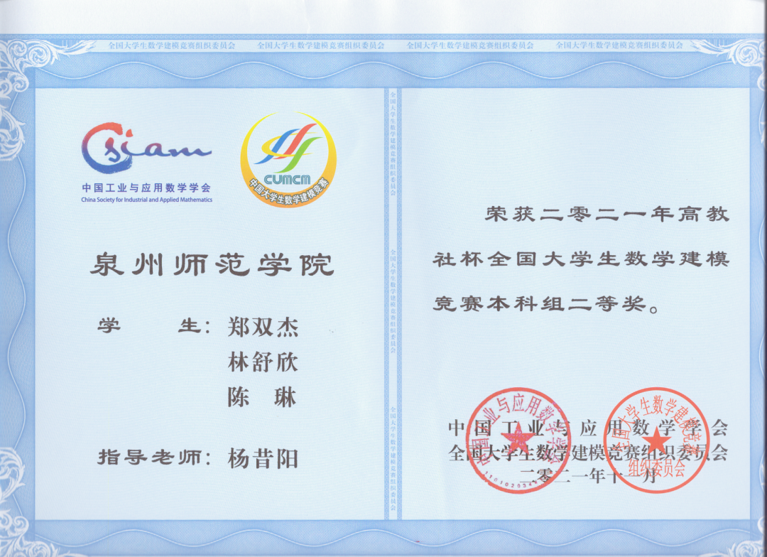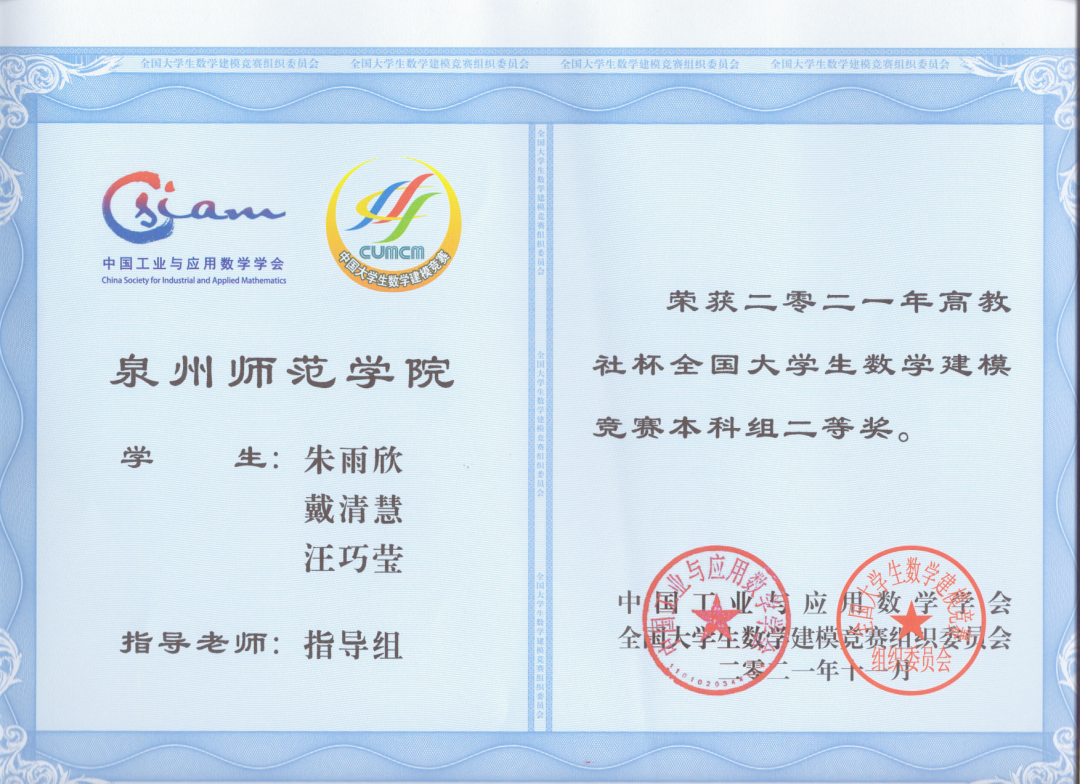 2021年11月荣获全国大学生数学建模竞赛国家级二等奖二项,省级一等奖三项,省级二等奖八项。