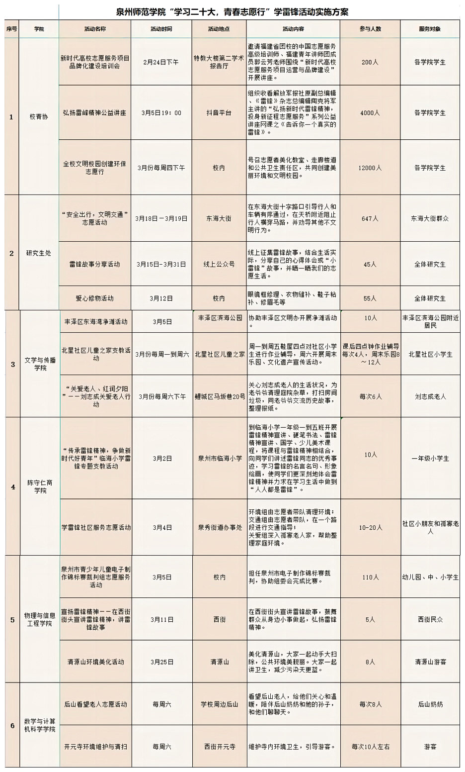 今年3月5日是全国第60个“学雷锋纪念日”。近日,习近平总书记对深入开展学雷锋活动作出重要指示。为深入贯彻落实党的二十大精神,学习贯彻习近平总书记重要指示精神,进一步落实省委部署实施的“深学争优、敢为争先、实干争效”行动,传承和弘扬雷锋精神,展现新时代泉师青年责任与担当,校团委决定开展“学习二十大,青春志愿行”学雷锋主题教育,号召各二级学院团委广泛开展新时代文明实践和志愿服务活动,具体实施方案如下。