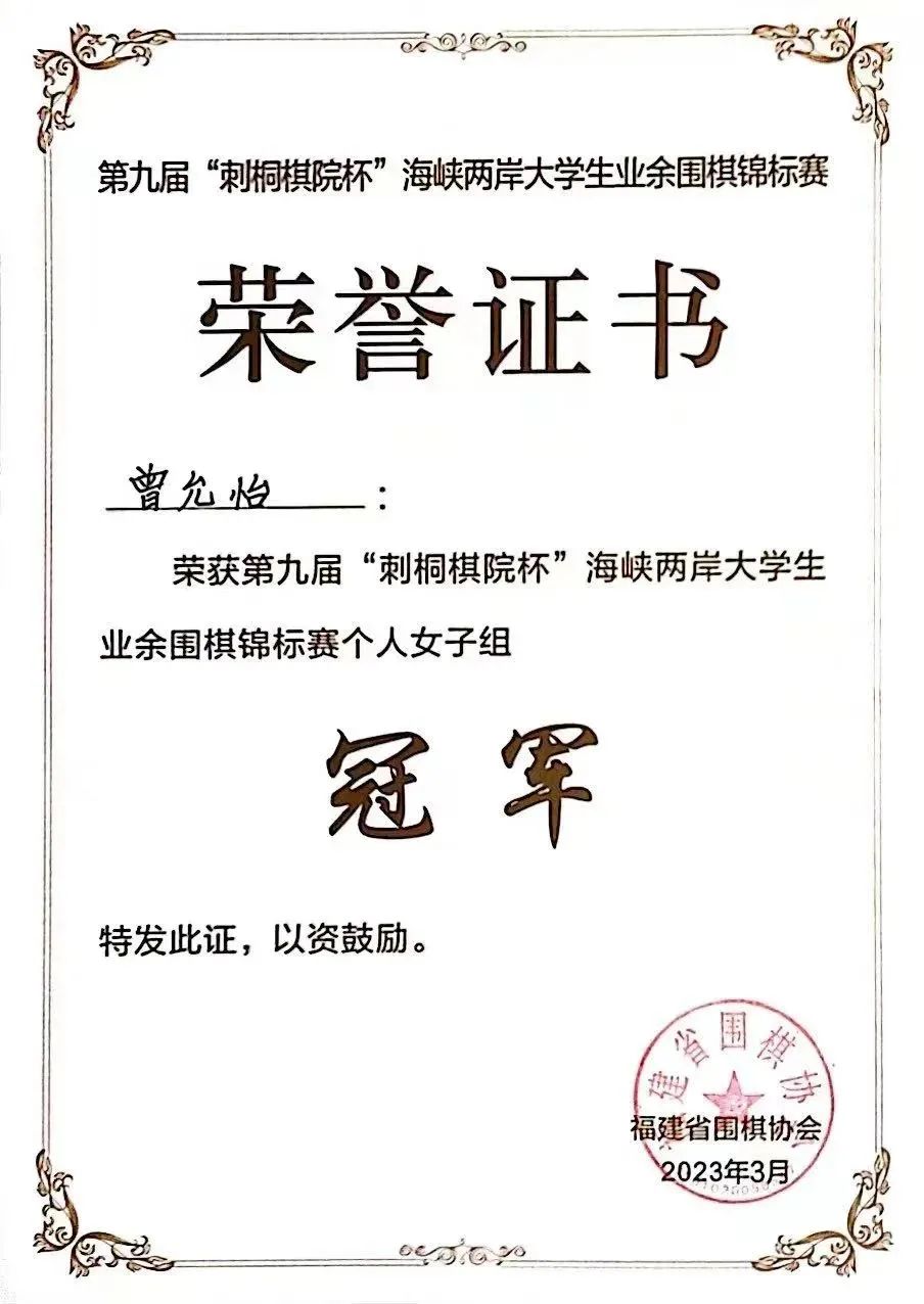 2023年3月10日至12日,由福建省教育厅主办的第九届“刺桐棋院杯”海峡两岸大学生业余围棋锦标赛在泉州晋江举行。开云曾允怡同学荣获女子组冠军,并且在全体运动员个人排名中取得第13名的好成绩。三项赛事中开云代表队获得团体赛第九名的佳绩。