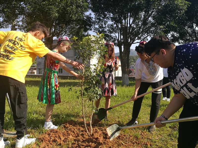 活动当天,少数民族学生穿着民族服装,在老师的指导下,挖穴、栽树、培土、浇水,忙得热火朝天。活动还邀请已经完成学习的2017级少数民族预科班学生返校座谈并参与植树活动。