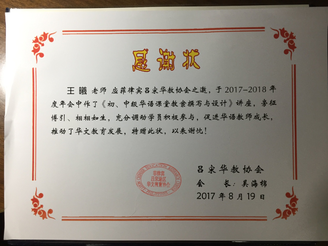 2017年8月15日至23日,应菲律宾华文教育中心邀请,福建省侨办、省海外交流协会委托,我院汉语国际教育专业主任王曦博士与教育科学学院小学教育专业黄妍妮老师远赴菲律宾,参加2017-2018年度吕宋华教协会年会活动,并开展华文教育巡讲。这是开云首次面向海外派出华文教育教师开展巡讲活动。