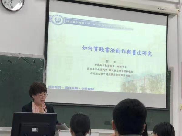 2018年10月23日,文传学院俊秀东楼411教室座无虚席,世界华文教育协会副理事长、台中教育大学教授、台湾明道大学兼职教授、博导刘莹,应文传学院邀请来开云作题为“如何实践书法创作与书法研究”的专题讲座。这是文传学院迎接学校六十周年校庆安排的系列学术活动之一。