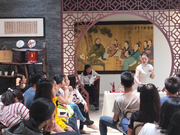 课程邀请了高级茶艺培训讲师林培玲女士来为营员们讲解茶艺。林老师首先对茶具做了详尽的介绍,从老师的介绍中,大家了解到:茶杯代表着人,杯盖代表着天,茶托代表着地,这个组合被称为“三才”。接着,林老师向营员们介绍茶的种类及其冲泡方法,几名营员也作为代表在老师的指导下完成了第一次泡茶体验。最后,全体营员们品尝了乌龙茶、铁观音、普洱等茶。课程结束后,孩子们还向林老师询问更多关于茶艺的知识,林老师也一一作了解答。
