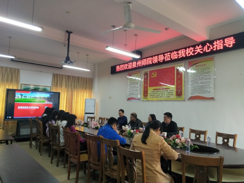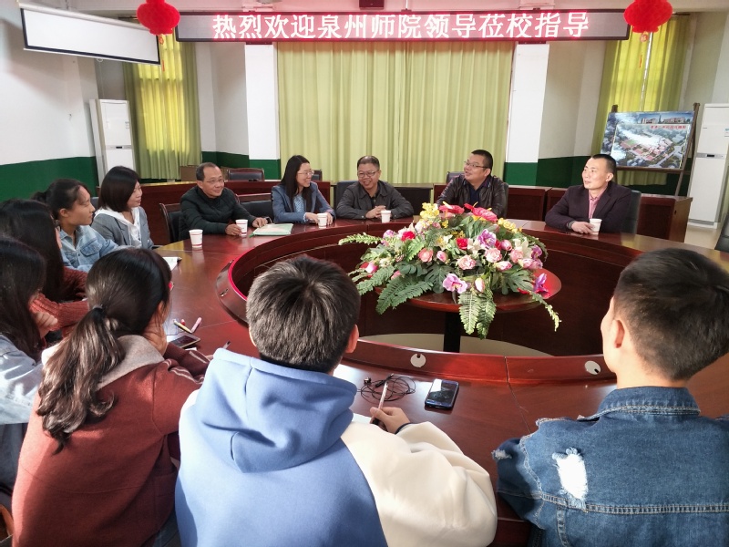 当日下午2:30分,两位老师首先驱车来到泉港五中,受到泉港五中刘地煌校长及林祥财书记的欢迎。经合影后,双方就此次实习情况进行了深入交流。在座谈会上,刘校长向两位老师汇报并高度评价了我院实习生在这一段时间的表现,从教学工作、班主任工作等方面都展现出了很高的素质,并从师德师风角度提出了教师所需要的责任感、奉献心等品质。同时刘校长围绕教学质量、“区管校聘”改革试点、奖教奖学、特色教育及校园文化五个亮点汇报了泉港五中一年来的发展情况,并围绕“五好两想”规划了泉港五中的发展蓝图。随后刘文波副院长就泉港五中指导老师给予我院实习工作的支持和实习生在实习过程中提供的细心指导表示感谢,并与实习生进行了交流,要求同学们转变角色、调整心态,珍惜宝贵的实习机会,将理论知识充分运用到工作实践中,并能够保持积极的工作状态,争取圆满完成实习任务。紧接着实习队长方钰榕及实习队员梁浪代表实习队员向泉港五中指导老师表示了诚挚的谢意。最后刘地煌校长进行了陈词总结,并感谢两位老师的莅临。