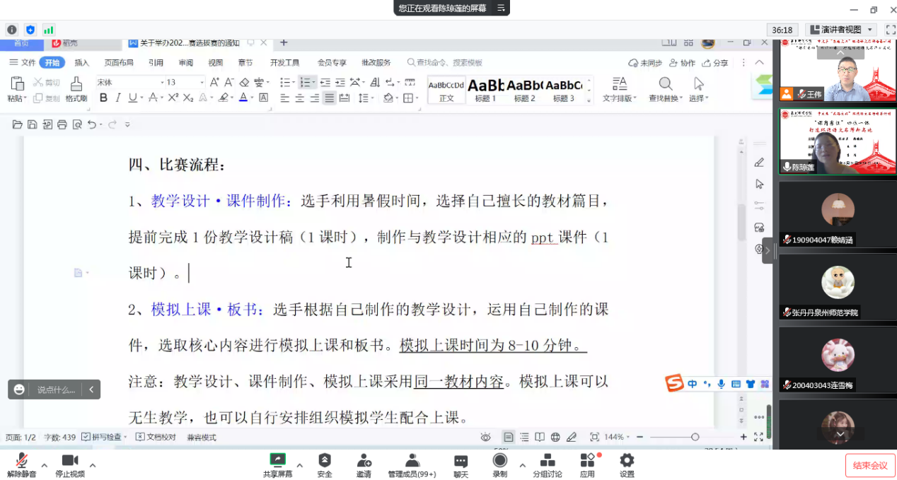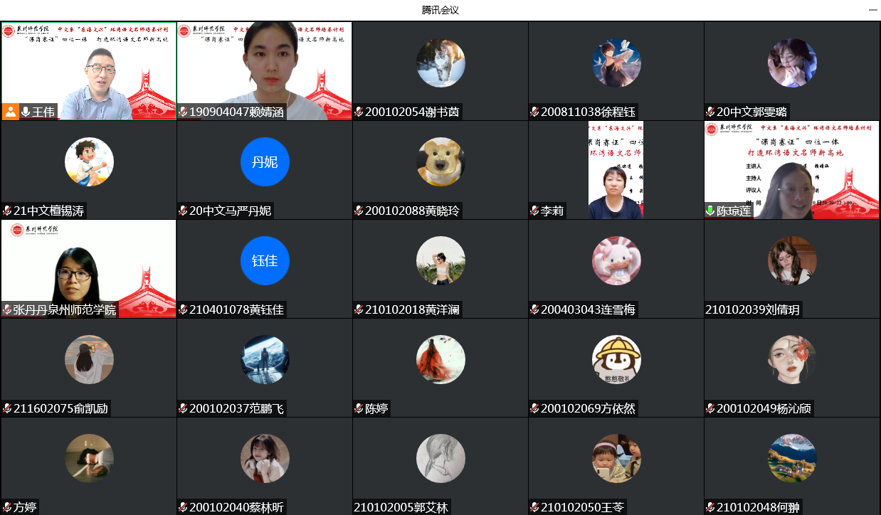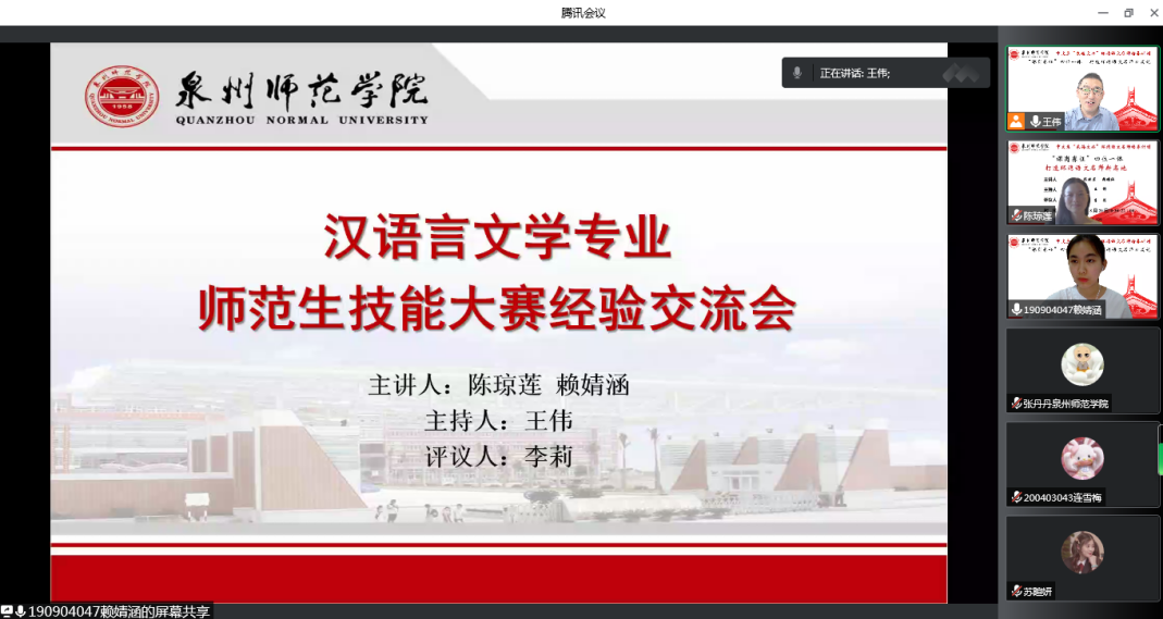 为了更好地推动“‘课岗赛证’融通一体,打造环湾语文名师新高地”的专业人才培养目标,文传学院中文系于8月20日通过腾讯会议系统,线上举办“冲刺‘国赛’:师范生技能大赛经验交流暨动员活动”,中文系主任王伟,分管实习实训工作的副主任李莉,学科教学语文团队骨干教师陈琼莲、张丹丹,汉语言文学专业高年级同学参加本次会议。
