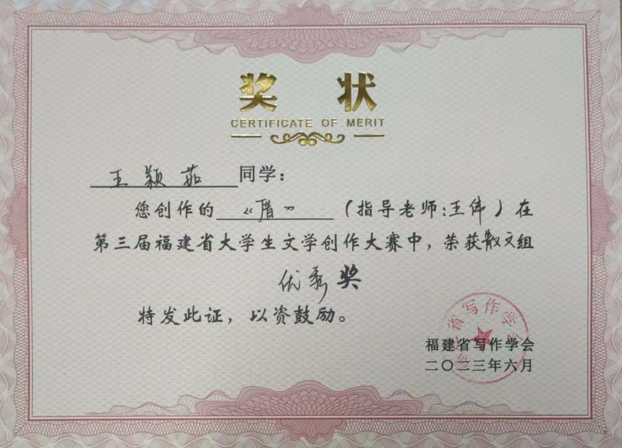 由福建省写作协会主办的“第三届福建省大学生文学创作大赛”结果于日前揭晓,文传学院汉语言文学专业2022级王颖茹同学撰写的《厝》荣获优秀奖。