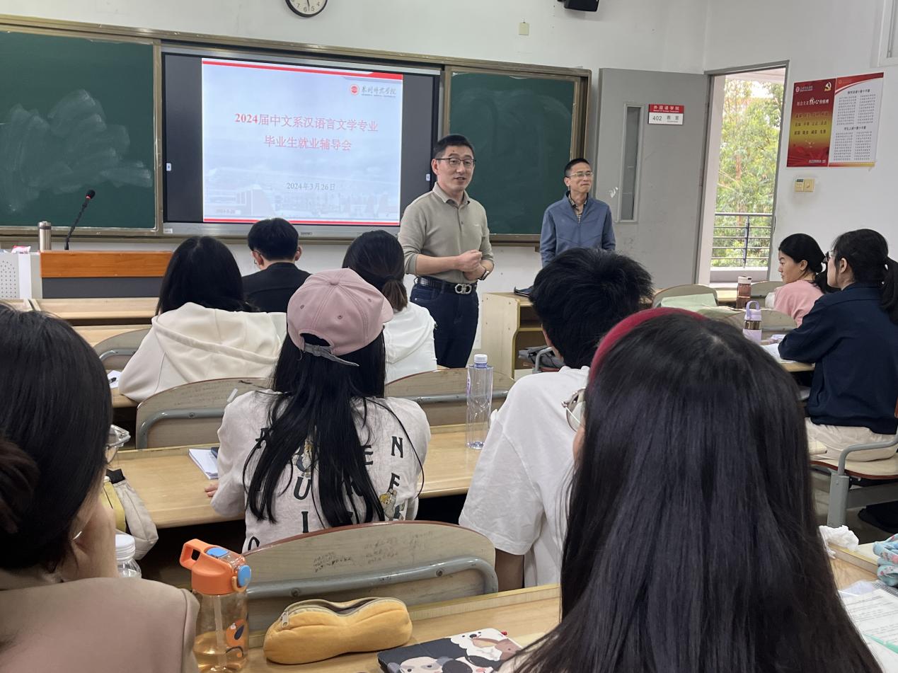 为了凝心聚力推动学生高质量就业,完善人才培养体制机制,科学筹划学科与学位点布局调整,做好师范类专业认证中期审核“后半篇文章”,文传学院中文系根据上级统一部署,于3月26日在俊秀文学院大楼西楼402教室,举办“2024届毕业生就业辅导活动”。院内学工办相关人员、系内部分硕士生导师(含兼职外聘)、青年骨干教师、在校应届毕业生(含联合培养研究生、第二学位本科生)参加本次会议。