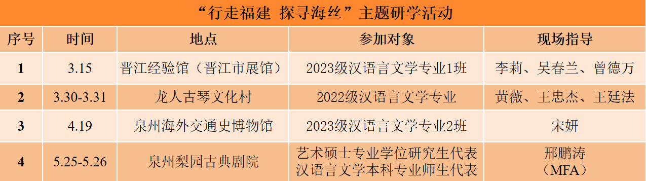 为了做好师范类专业认证中期审核“后半篇文章”,落实汉语言文学“省级一流本科专业”建设指标要求,布局教育硕士专业学位研究生授权点培育创建,文传学院中文系根据上级部署,于2024年春夏学期精心筹划四场“行走福建 探寻海丝”主题研学活动,为青年骨干教师、在学研究生(含联合培养)、优秀本科生“探寻中华文明基因,感悟文化磅礴伟力,谱写青春多彩华章”创设条件。