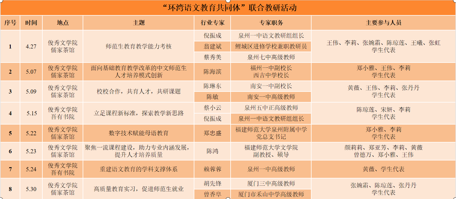 为了发挥福建省高校课程思政优秀教学案例“凝练闽南意象,讲好海丝故事”示范引领作用,做好师范类专业认证中期审核“后半篇文章”,落实汉语言文学“省级一流本科专业”建设指标要求,助力教育硕士专业学位研究生授权点(培育)创建,文传学院中文系根据上级总体部署,于2024年5月期间连续举办十二期“名师名家面对面”系列讲座,并在此基础上接续开展八场“环湾语文教育共同体”联合教研活动,共研共商“数智时代母语教育的中文学科支撑体系”,聚力打造因潮而兴的语文教育“东海学派”与“国学研究”东南高地,服务“海丝名城”基础教育事业高质量发展与文化创意产业内涵式跃升。