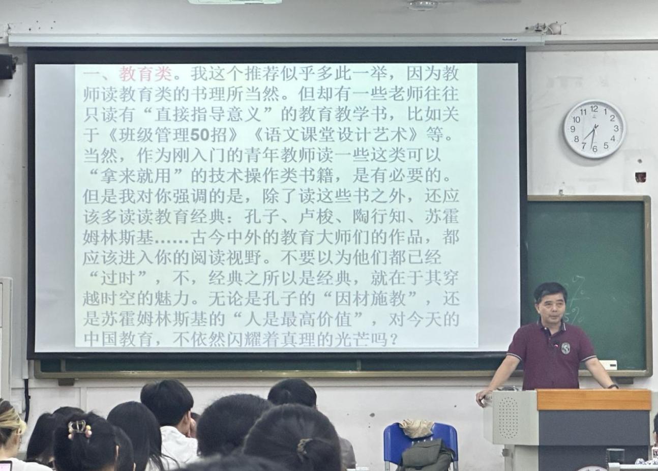 在题为《中学语文阅读思维训练方式》的讲座中,倪振成老师认为阅读对尚在成长中的青年教师大有裨益,使之“更有底气、更专业、更科学”。他还分享自己的阅读书单,鼓励大家珍惜时间、把握当下,立稳学科素养之基。紧接着,蔡小云老师在题为《回首所来径,苍苍横翠微——思维美感培养与高中文学类文本阅读教学关系》的发言中同样强调阅读的重要性。其还以自己的教学实践为例,提醒同学注意情境创设的关键问题,并指出“好的课堂导入要符合课程内容与新课标要求,能激发学生兴趣,为后续学习作好铺垫”。在互动环节,针对同学的踊跃提问,两位老师认真做了解答,令在场师生受益匪浅。