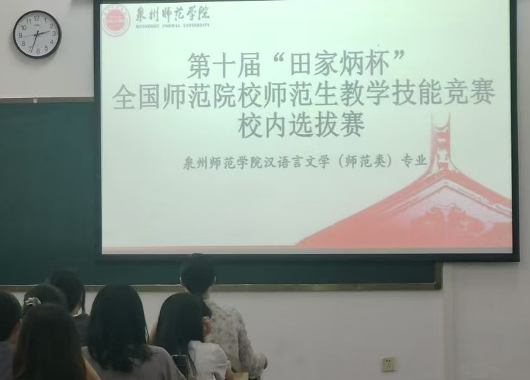 为了落实“学生中心、产出导向、持续改进”OBE理念,落细“申硕认证一体推进,培养拔尖创新人才”战略构想,发挥福建省高校课程思政优秀教学案例“凝练闽南意象,讲好海丝故事”示范作用,文传学院中文系根据《关于举办第十届“田家炳杯”全国师范院校师范生教学技能竞赛的通知》等文件精神,于9月24日(周二下午)在俊秀文学院东楼312教室,举办“师范生教学技能竞赛(汉语言文学组别,高中学段)”校内预选赛。本次活动由学院教学科研办工作人员、学科语文教学团队骨干成员、近两届“国赛”“省赛”获奖选手以及“教育实习基地”名师代表组成考评阵容,在学研究生(含联合培养)、部分高年级本科生到场观摩。