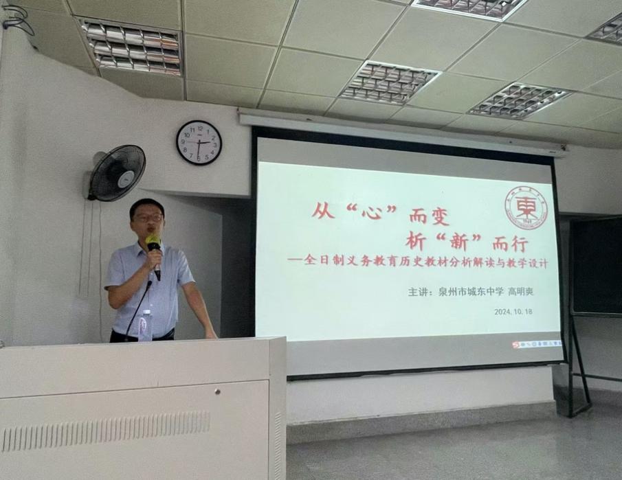 2024年10月18日下午,我系“名师讲堂”第一期讲座在文A213教室圆满举行。本次讲座邀请了泉州城东中学的高明爽老师担任主讲嘉宾,由历史系副主任徐丹主持,刘智豪老师及60余名历史系学生共同参与。