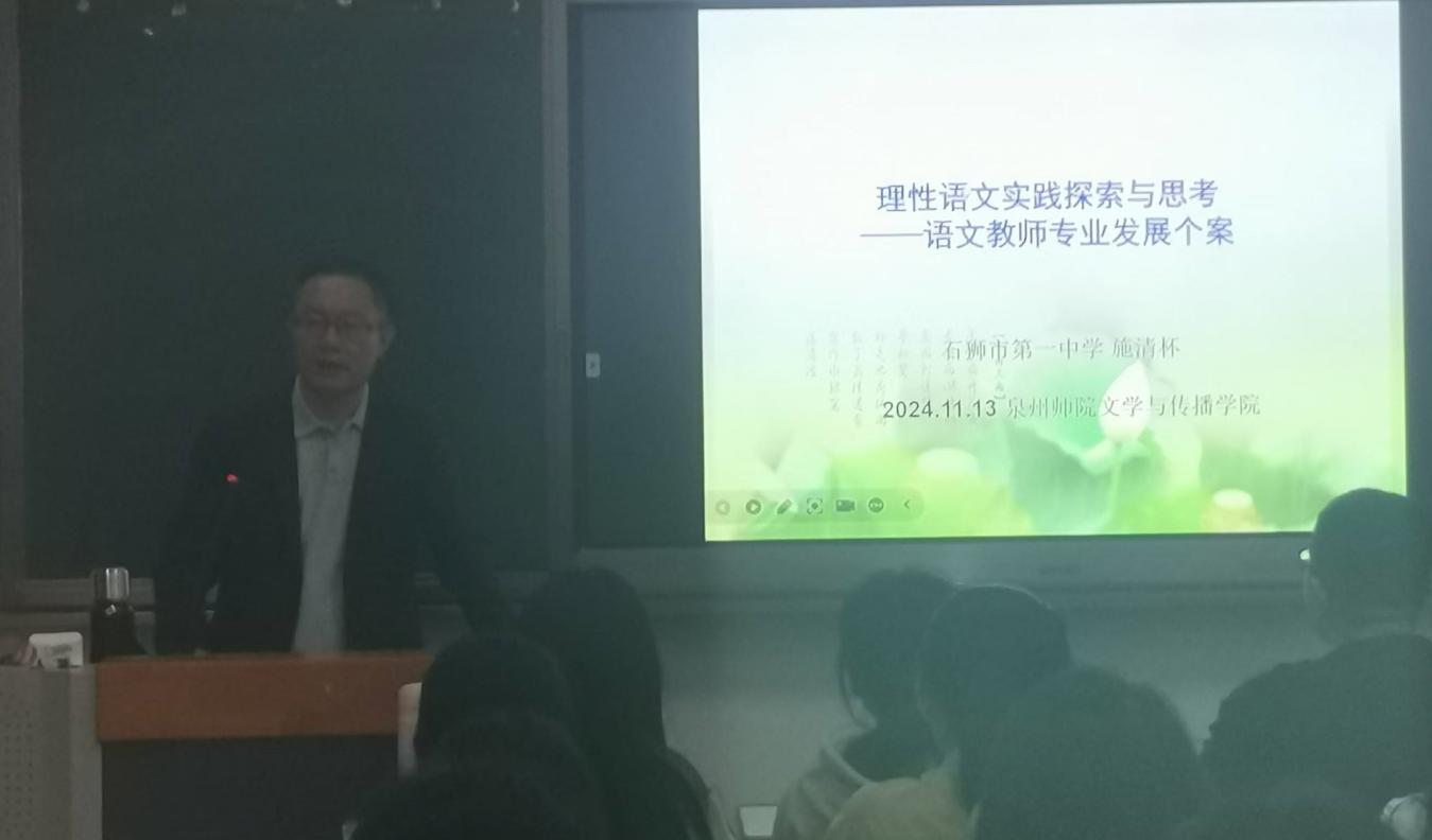 为了提早谋划来年学生就业工作,超前布局师范类专业三级认证,落细落实省级一流本科专业建设指标要求,助力教育硕士专业学位研究生授权点培育创建,文传学院中文系按照上级整体部署,特邀石狮市第一中学正校级干部、正高级教师施清杯,于1113日(周三)上午在俊秀文学院东楼304教室,为学科教学团队骨干教师、在学研究生(含联合培养)、汉语言文学高年级本科生,做了一场题为《理性语文实践探索与思考》的精彩报告,并指导“从胜任迈向卓越”环湾语文主题教研活动。