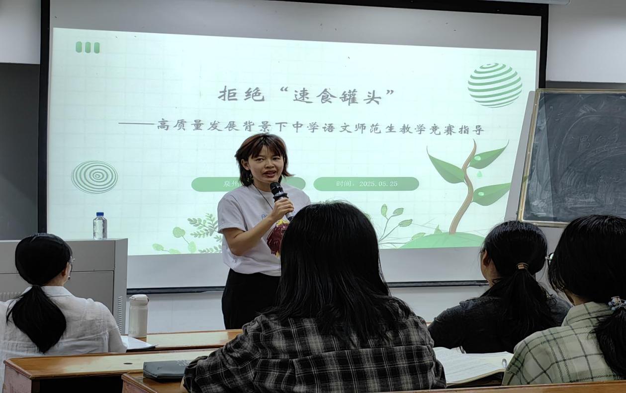 5月27日上午,泉州一中方静老师为中文系师范生做《拒绝“速食罐头”——高质量发展背景下中学语文师范生教学竞赛指导》的专题讲座。讲座由中文系专任教师陈琼莲主持。