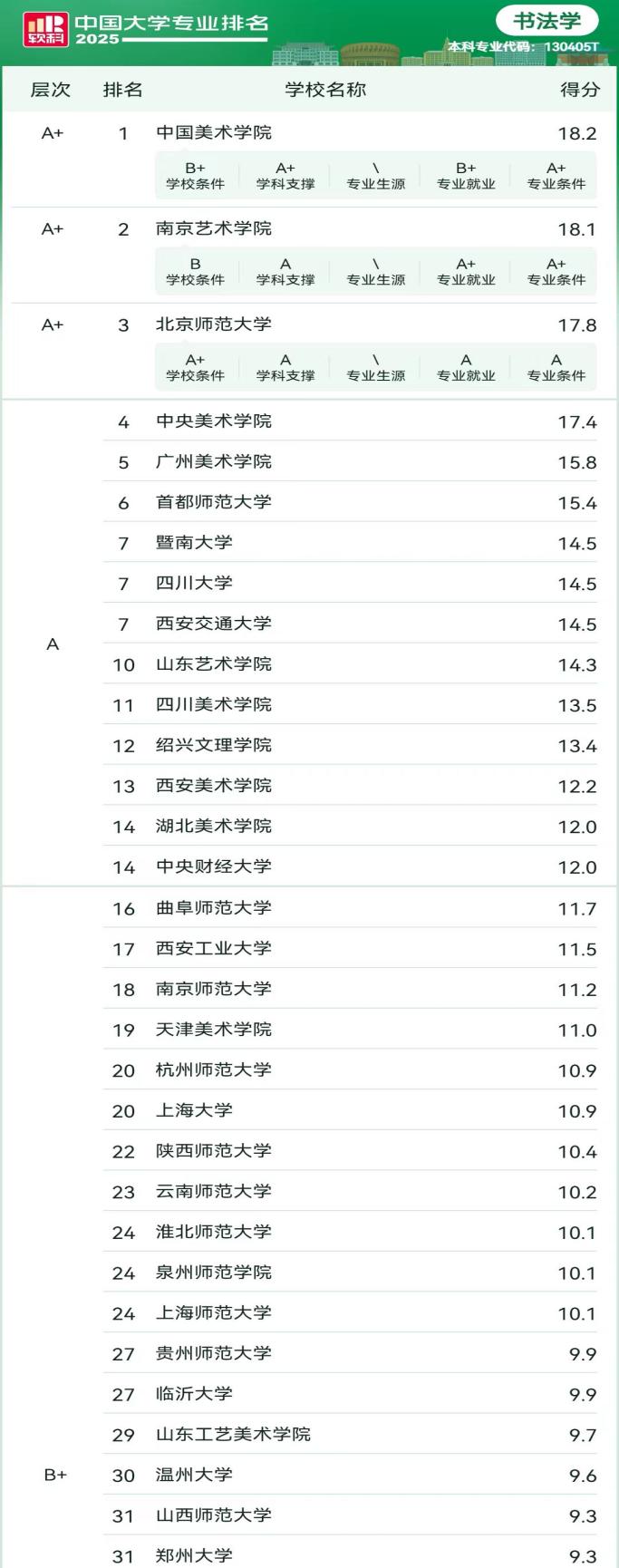 2025618日,高等教育专业评价机构软科正式发布“2025软科中国大学专业排名”,我院书法学专业以突出的教学质量以及广泛的社会影响力,获评B+层次,位列全国第24名,相较去年全国排名35,进步11位。