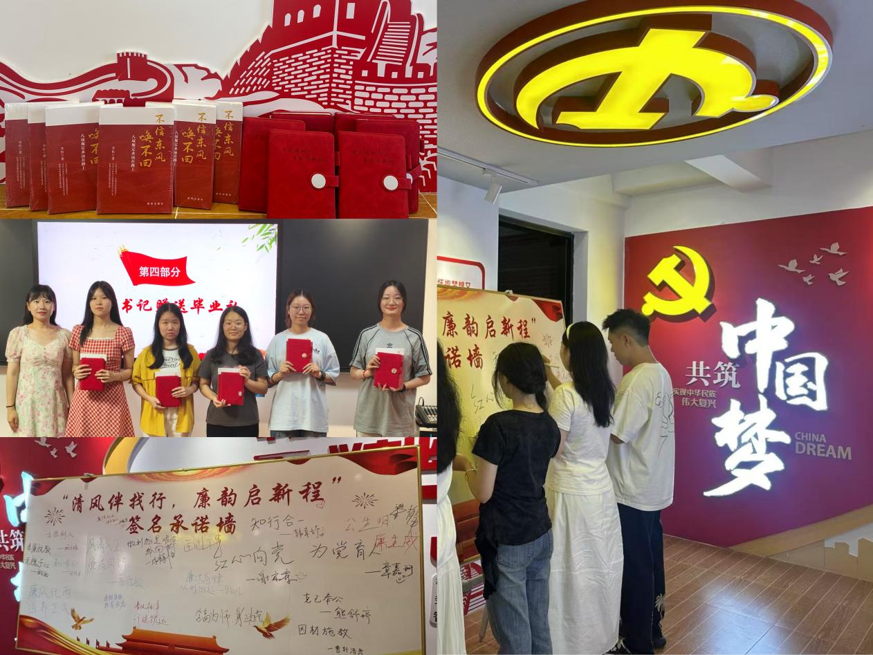 活动中,全体党员在支部书记洪盈莹老师的带领下重温入党誓词,再次铭记对党的忠诚承诺。支部精心准备了《不信东风唤不回:八项规定永远在路上》书籍与定制笔记本作为毕业赠礼,勉励党员行稳致远、永葆清廉本色。活动最后,毕业生们在廉洁承诺展板上写下廉洁决心,许下庄严承诺。
